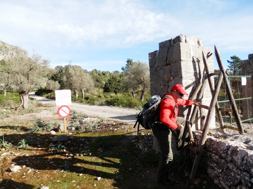 Tomamos la carretera Ma-10, que une Lluc con Pollença, y en el kilómetro 14’200 se encuentra la entrada a la finca de Femenía. Aparcamos nuestro vehículo en un espacio del arcén de pequeñas dimensiones. Iniciamos la excursión saltando por un botador situado al lado izquierdo de la barrera de entrada a la finca. Este botador, de madera, está en bastante mal estado, ya que le faltan algunos peldaños en la parte de bajada. Una vez que hemos superado la entrada en la finca, tomamos una pista de tierra que seguimos de frente.