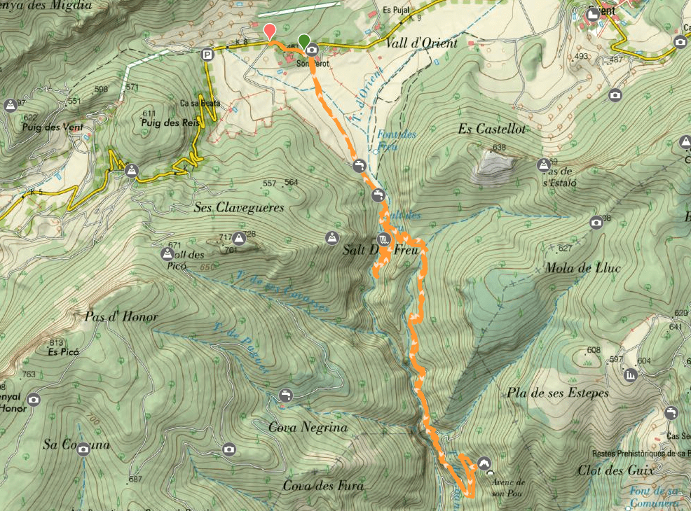 La Ruta “Salt des Freu y Avenc de Son Pou desde Orient» discurre por lugares de gran belleza. Destacan sobre todo los saltos de agua que en caso de llevar agua adquiere una magia especial con sus cascadas y su entorno que constituyen un verdadero espectáculo. La Ruta que aquí propongo pasa por este lugar para luego continuar bajando durante un rato por la Vall de Coanegra y posteriormente subir al Avenc de Son Pou, grandiosa cueva a la que se accede por una galería abierta en la roca