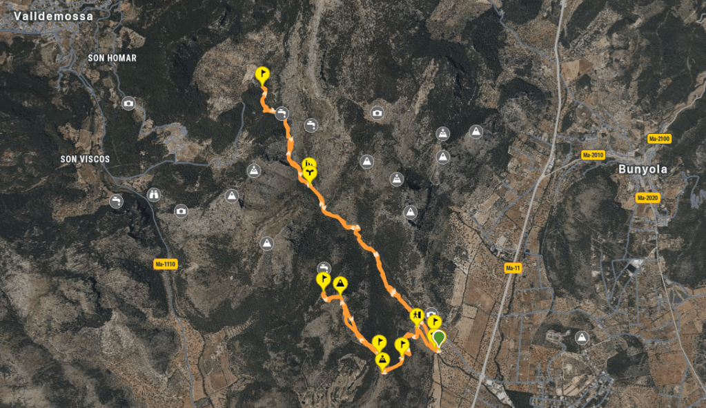 Unos minutos más tarde alcanzamos un portillo sin puerta en una pared de piedra. Esta pared constituye la línea divisoria de los términos municipales de Bunyola y Valldemossa. Cruzamos el portillo y entramos en el término de Valldemossa. Un poco más adelante llegamos a un bonito tramo del camino que aún conserva su antiguo empedrado. A mano derecha vemos en el torrente unas pozas con un agua limpia y cristalina. Poco después nos encontramos con una bifurcación. De frente tenemos el camino del Comellar de ses Mines, que tras un sinuoso recorrido enlaza con el Camí de Pastoritx, que une esta posesión con la Carretera de Valldemossa.