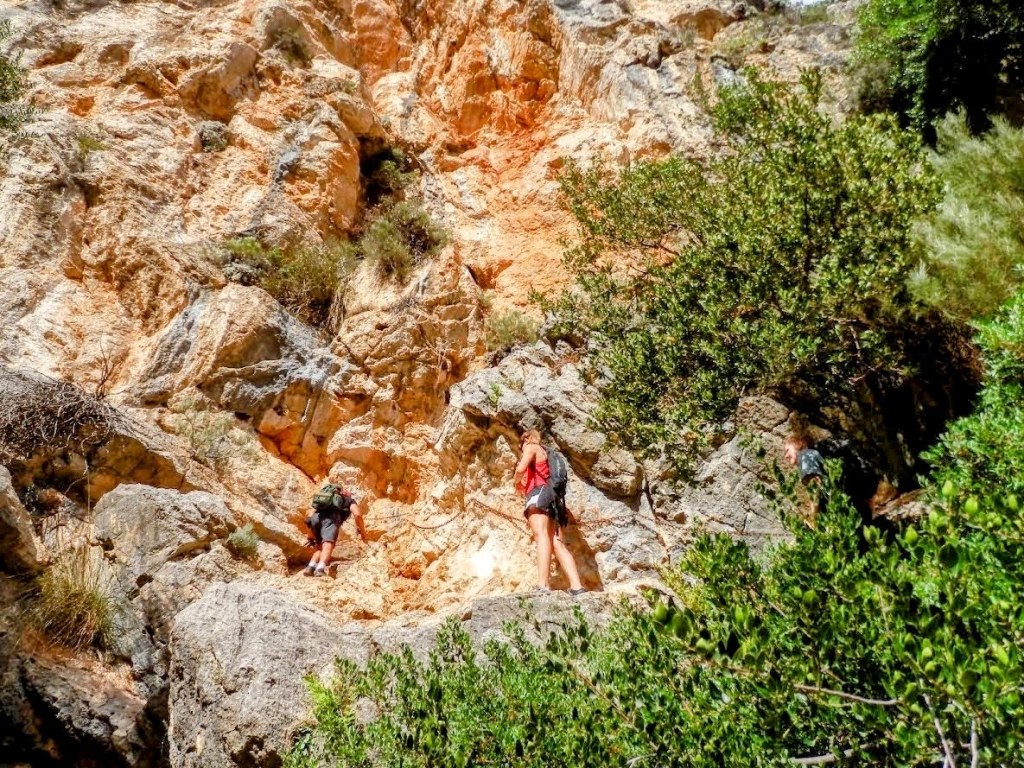 Llegamos hasta el Paso de Llis que se reconoce fácilmente porque tiene unas cadenas sujetas a la roca y que sirven para ayudarnos en la subida a superar este paso. Superado el paso continuamos subiendo para luego descender y volver subir. Llegamos hasta una pared de piedra con un portillo y una puerta rudimentaria hecha con troncos de árboles. Seguimos descendiendo un poco más y luego comenzamos a subir de nuevo. Nos encontramos con un cruce de caminos y tomamos el de la derecha que conduce al refugio de Tossals Verds y que tiene una barandilla a modo de protección.