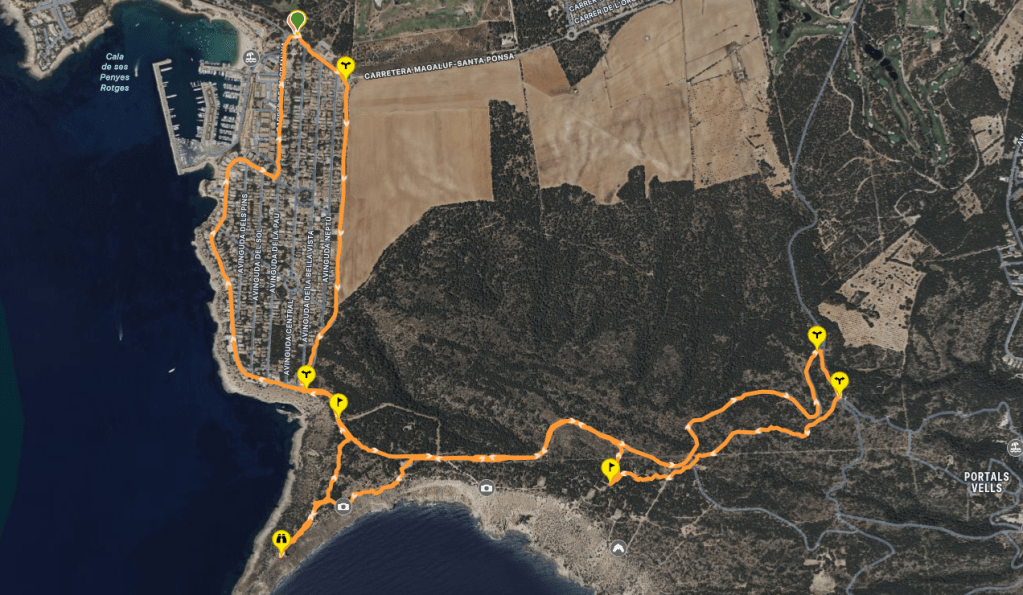 Iniciamos la excursión en este punto dirigiéndonos a la rotonda que he mencionado antes por el Paseo de Calviá. Al llegar a la rotonda giramos a la derecha para tomar un camino de tierra que discurre paralelo a la Avenida de Neptuno. Este camino llega hasta los acantilados y luego gira a la izquierda. A pocos metros veremos un cartel informativo de la Reserva Marina de la Isla del Toro. Aquí hay un mirador conocido con el nombre de Clot d’es Moro y unas larguísimas escaleras sin barandilla por la que se accede a la zona de baño. El Mirador nos ofrece unas magníficas vistas de los acantilados.