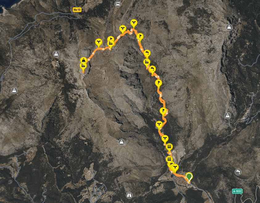 Continuamos andando unos escasos 300 metros más y nos encontramos con una desviación a nuestra izquierda que nos permite acceder al conjunto arqueológico/etnográficos del navetiforme de Ses Sínies. Es un yacimiento arqueológico de la Edad del Bronce (1700-900 A.C.), A partir de aquí iniciamos la ascensión a la Mola de s´Esclop ( los hitos indicadores cambian de color, pasan de naranja a morado).