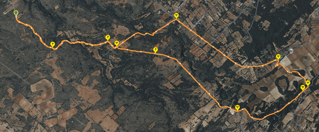 La ruta Sant Jordi y caminos de los alrededores es una ruta fácil y sencilla que transcurre por caminos de los términos municipales de Llucmajor y Algaida. Aparcamos nuestros vehículos al final del Camí de Binissalom, justo cuando comienza el Camí de Son Mandevi, e iniciamos la excursión por este ancho camino de tierra. Pasamos por una barrera abierta donde hay un cartel con la indicación para bicicletas de “Llucmajor-Algaida»