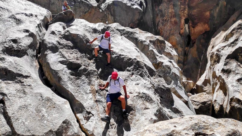 Poco después llegamos a Es Degotis, donde vemos como gotea el agua de la roca que tenemos a nuestra izquierda. Al parecer ese lento goteo se mantiene durante todo el año. Seguimos avanzando por el lecho del torrente entre las piedras que vamos sorteando como podemos y llegamos al Pas des Grassos Estrenyeuvos, que también lo superamos con la ayuda de cuerdas.