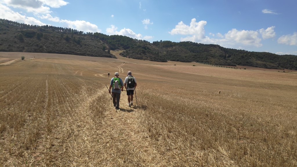 Después de visitar este lugar proseguimos nuestra caminata y al cabo de unos cuantos metros nos encontramos con una bifurcación, convenientemente señalizada. De frente tenemos la variante de Montejurra, un poco más corta (16.8 km a Los Arcos); es boscosa y pasa por las laderas de Montejurra y por Luquin y poco después enlaza con el camino oficial. A la derecha, tenemos la ruta tradicional, un poco más larga (17.9 km a Los Arcos). Pasa por Azqueta y Villamayor de Monjardín y es la que seguimos.