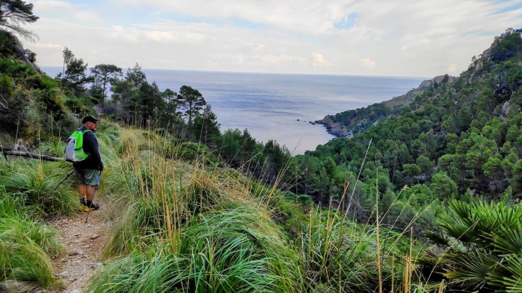 Superado el paso, tomamos dirección ligeramente a la izquierda y seguimos ascendiendo, por un terreno sin camino aunque no tan inclinado. En poco tiempo alcanzamos una especie de Mirador Natural, es un balcón que nos ofrece una magnífica panorámica de esta parte de la costa norte mallorquina. Después de disfrutar de las vistas, continuamos subiendo, ahora entre pequeñas rocas y por un terreno de inclinación moderada, hasta llegar a la cima inmediata, que es la cota 286. Esta cumbre nos ofrece una amplia y despejada vista de la Coma de s’Evangèlica, con el Torrent del mismo nombre abajo y el Penyal de s’Evangèlica, que lo tenemos enfrente.