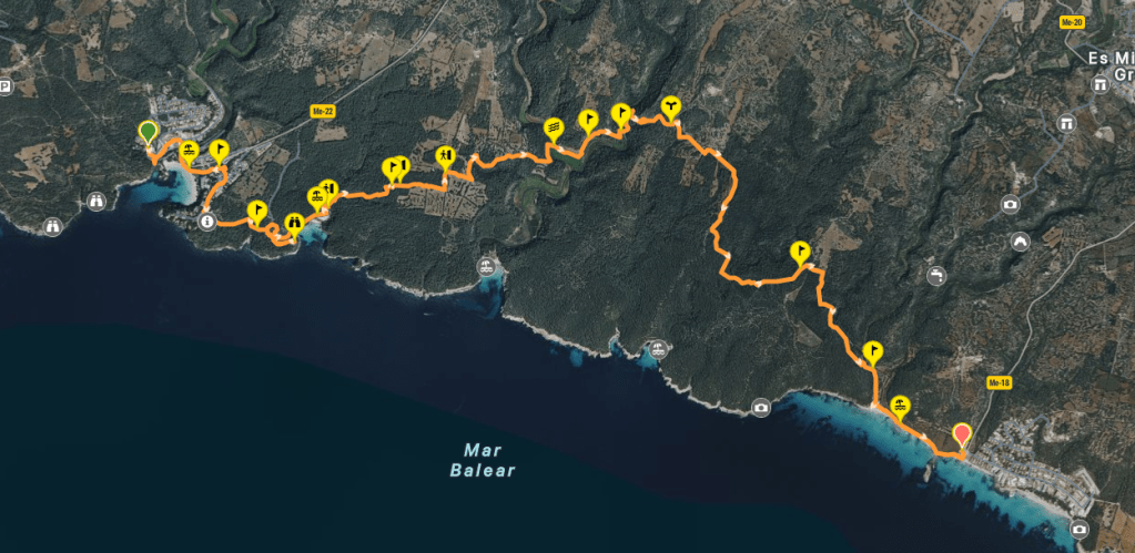 Esta etapa del Camí de Cavalls la iniciamos en la parte baja de la urbanización de Cala Galdana. Comenzamos a caminar por el Passeig del Riu. Al llegar a la rotonda continuamos por la Travesía de Cala Galdana, cruzamos el torrente y vamos bordeando la playa del mismo nombre. En poco tiempo vemos un poste GR que señala la dirección a seguir. Se trata de un camino de tierra que se va adentrando en zona boscosa y luego sube sin contemplaciones, a través de unas interminables escaleras hasta la parte alta, donde se halla el Hotel Melia Cala Galdana, lugar de nuestro alojamiento.