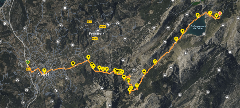 Al tratarse de un recorrido solo de ida dejamos un coche en el aparcamiento de Cúber y el otro en Sóller, en el lateral derecho de la Carretera de Desviament (Ma-11), justo donde finalizamos la Etapa 6 y empezamos la de hoy.