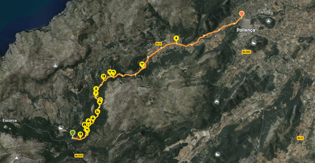 Al tratarse de un recorrido solo de ida dejamos un coche en Pollença, aparcado frente al Refugio del Pont Romá y otro en el Parking del Refugio de Son Amer (Lluc), justo donde finalizamos la Etapa 8 y empezamos la de hoy.