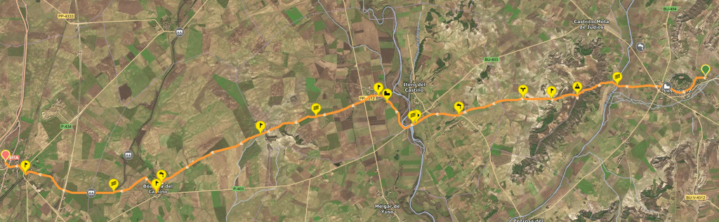 Esta etapa se inicia en Castrojeriz. Desde el Hostal “El Manzano”, lugar en el que pernoctamos la noche anterior, situado en la entrada del pueblo tomamos la Avenida de la Colegiata y luego seguimos por la calle Real de Oriente, la Plaza Mayor y la calle Real de Poniente. A la salida cruzamos la carretera de Villadiego (BU-404) y continuamos por una pista de tierra. Poco después cruzamos otra carretera local (BU-400).