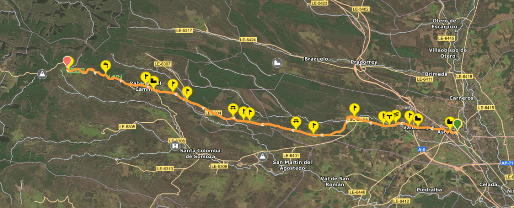 Esta etapa se inicia en Astorga. Desde los apartamentos “Domus Aurea”, lugar en el que pernoctamos la noche anterior, situado en la calle del Mesón, nos dirigimos al otro extremo de la ciudad, tomando las calles El Cristo, Enfermeras Mártires, Lino Marcelo Macías, Postas, Santiago y Doctoral, desembocando delante del Palacio Episcopal de Gaudí. Pasamos junto a la Catedral y tomamos la calle Portería y luego la calle Leopoldo Panero y seguimos de frente por la calle San Pedro.