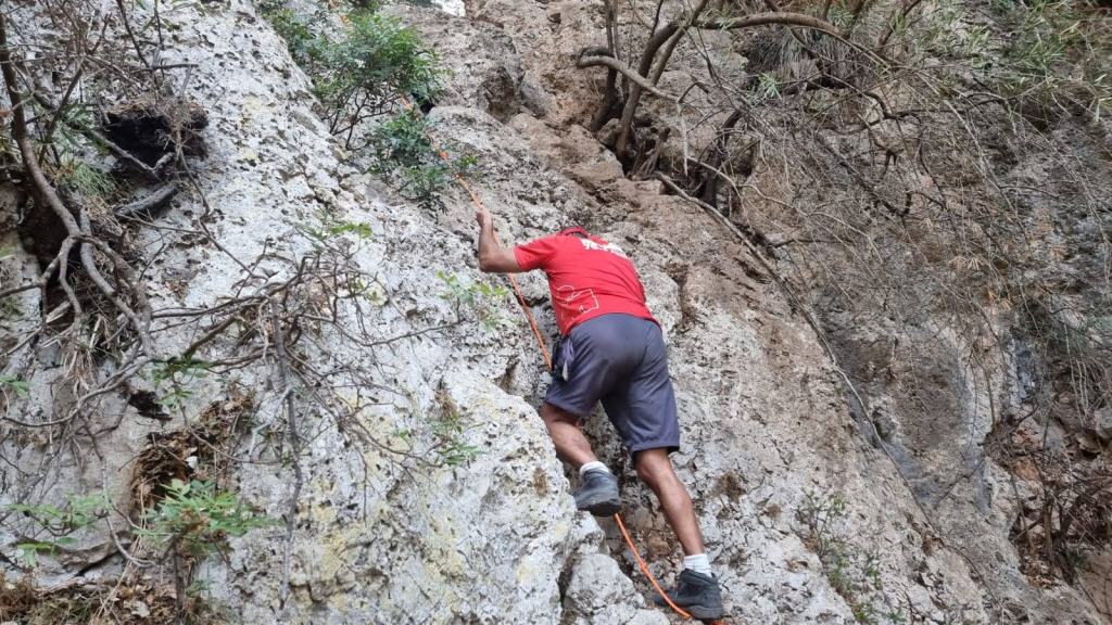 Visitada la cueva, proseguimos por el camino que va rodeando las paredes del penyal. Este sendero presenta algunos tramos empedrados y algunos “marjades». Poco después entramos en un gran roquedal y a continuación tenemos el Pas de Ca’n Fil. La primera parte de este paso es una canal estrecha equipada con cuerdas para facilitar el ascenso, ya que el terreno es muy resbaladizo. El paso propiamente dicho, está situado a 418 m de altitud y es un escalón bastante vertical de varios metros de altura. También está equipado con una cuerda que facilita el ascenso, ya que no hay muchas presas para asegurarse. Es un paso cuya dificultad podemos calificar de difícil, por lo tanto hay que extremar el cuidado. En realidad es un salto de la torrentera, por la que vamos a continuar una vez superado el paso.