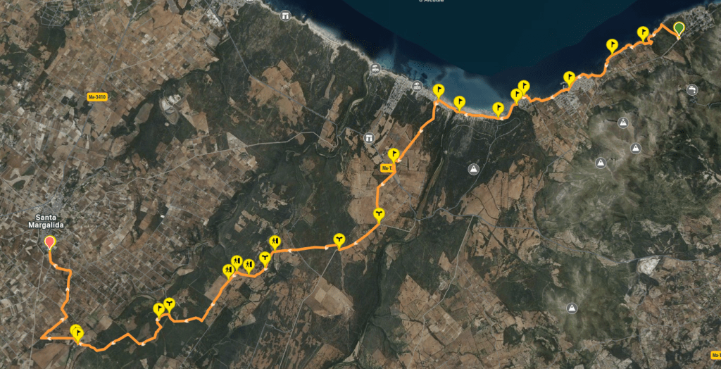 La “ Ruta Artà-Lluc GR 222-Etapa 3″, es una ruta solo de ida que se inicia en la urbanización de Betlem y finaliza en Santa Margalida. El itinerario sigue la línea de la costa desde Betlem hasta Son Serra de Marina por un terreno de roquedales castigados por los temporales, de dunas de vegetación retorcida y de torrentes. A partir de Son Serra de Marina nos adentramos en el Pla de Mallorca, donde predominan los campos de cultivo, destacando las posesiones mallorquinas de Son Serra y Montblanc.