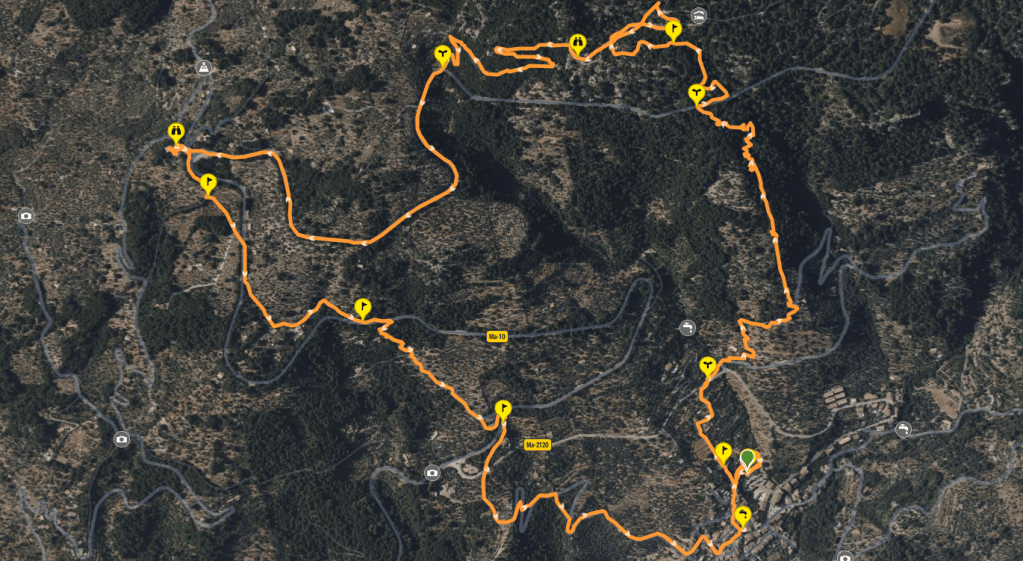En esta plaza tomamos las empinadas escaleras de la calle de la iglesia, que más arriba se convierte en la calle Tramuntana, rotulada como del Monte, y avanzamos entre notables edificios hasta enlazar con el empedrado y elaborado Camí de s’Alzina Fumadora, por el que transitamos de buena mañana. Aquí torcemos a la derecha por el camino que nos lleva hasta el aparcamiento donde dejamos estacionados nuestros coches y damos por finalizada esta bonita excursión matinal.