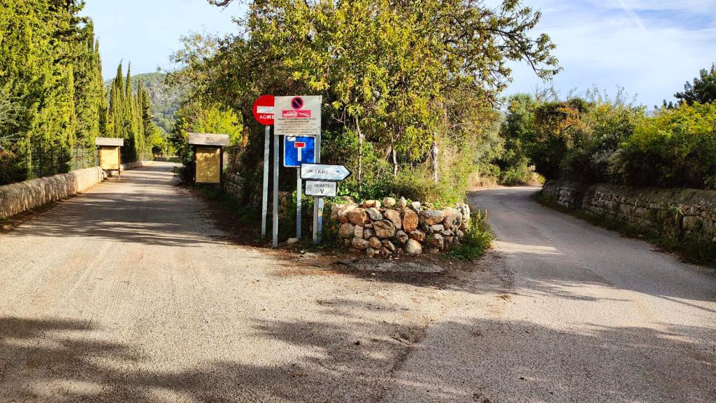 Tomamos la vereda de la izquierda, señalizada, en dirección al torrente. El camino es estrecho y en ocasiones se desdibuja. Luego se ensancha y presenta algún tramo con pared de sostenimiento. Pasamos por un par de eras de carbonero y poco después de sobrepasar un horno de cal y otra era de carbonero llegamos a una bifurcación. El camino de la derecha es el Comellar de sa Comuneta y conduce hasta Alaró. Continuamos por la izquierda y pronto ya podemos ver parte del Valle de Orient con la Sierra d’Alfàbia en el fondo. El camino ahora se ensancha y dibuja varias curvas en bajada.