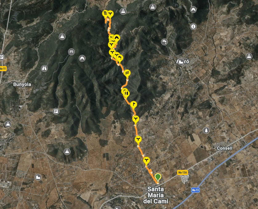 El punto de partida de este itinerario lo he situado en el aparcamiento de la estación, ubicado en las afueras de Santa María, entre las vías del tren y las instalaciones de la bodega de Macia Batle. Llegamos a este lugar por la carretera Ma-13A que procede de la autopista Palma-Inca. Dejamos aparcado nuestro coche y comenzamos a caminar en dirección a las vías. Tras cruzarlas seguimos por el Camí de Coanegra. Se trata de una carretera asfaltada en sus primeros 4,6 km, el tramo más tedioso de la excursión.
