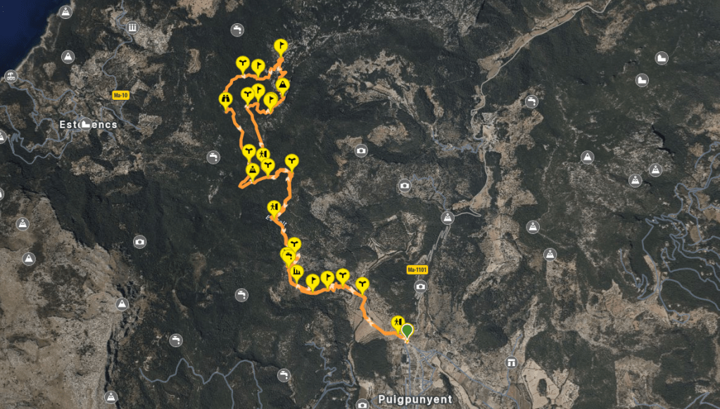 El punto de partida de este itinerario lo he situado en el Camino de la Vela, frente al Polideportivo. Allí dejamos aparcado nuestro coche y comenzamos a caminar en dirección a la salida del pueblo hacia Esporles y Banyalbufar por el Coll des Grau. Tomamos la carretera Ma-1101 que une Puigpunyent con la Granja de Esporles. Enseguida la abandonamos para dirigirnos a las casas de la posesión de Son Fortesa por el Camí Vell de Estellencs, siguiendo los indicadores del GR-221.