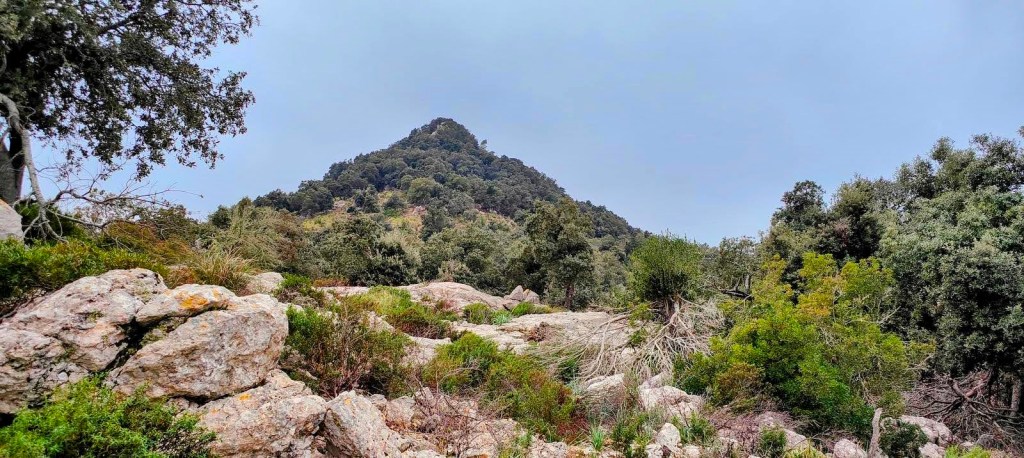 Una vez que hemos disfrutado de esta bella panorámica descendemos por el mismo sitio hasta alcanzar el cruce múltiple. Desde aquí nos dirigimos al camino de carro que por la izquierda conduce a Son Alzines y por la derecha al Pla Pelat. Caminamos unos metros por este camino dirección a Son Alzines hasta el punto donde comienza a descender y luego regresamos para continuar hacia el Pla Pelat. El camino va dibujando una semicircunferencia ofreciéndonos en algunos puntos una bonita estampa de la forma cónica del Puig Montibudell.
