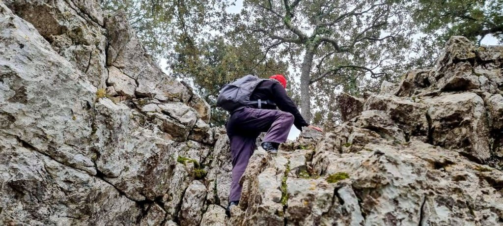 Tomamos el sendero que en fuerte subida nos aproxima a la base de los peñascos que tenemos a nuestra izquierda. Vamos rodeando el monte, sin camino ni indicación alguna, en busca del mejor sitio para hacer una trepada hacia la cima. Más al oeste encontramos una estrecha grieta escalonada abierta entre las peñas que me pareció factible. Solo tres miembros del grupo iniciamos la subida, el resto consideró más apropiado no hacerlo. Tras una primera trepada sin demasiada dificultad giramos a la derecha y seguimos subiendo por una ladera escalonada y tras una última trepada alcanzamos la cima.