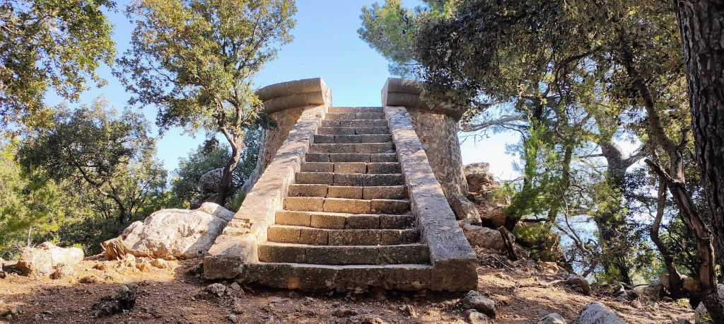 Unos metros más adelante alcanzamos una bifurcación. El camino de la derecha conduce a la Ermita de la Santísima Trinidad, que en esta ocasión obviamos. El de la izquierda sigue siendo el Camí de la Muntanya y por él continuamos. Poco después vemos a nuestra izquierda el Mirador dels Tudons. Es uno de los miradores mandados construir por el Archiduque Luis Salvador. Se trata de una torre cilíndrica de piedra a la que se accede por unas escaleras, también de piedra. Desde lo alto podemos observar, entre la copa de los árboles, lugares como Sa Foradada, el Monasterio de Miramar, Son Marroig, etc.