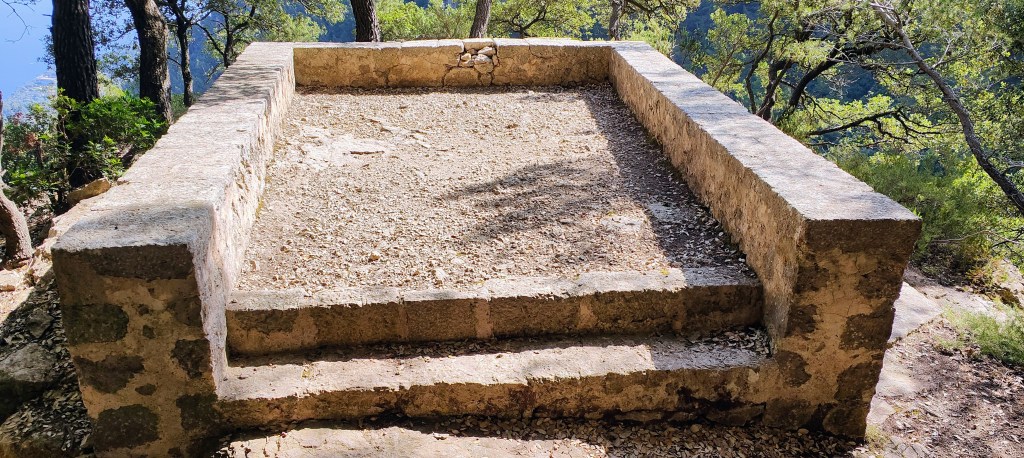 Subimos un poco más y alcanzamos el Coll de Son Gallard, situado a 766 m de altitud. Identificamos este collado por un banco de piedra que mandó construir el Archiduque Luis Salvador. En este lugar confluyen varios caminos. El de la derecha parte hacia la cima de la Talaia Vella y al Mirador de ses Puntes. El de enfrente, en bajada, se dirige al Pla des Pouet y a la izquierda tenemos el Camí de l’Arxiduc, por el que seguimos. Este emblemático camino, hoy integrado en la Ruta de la Piedra en Seco o GR 221, fue mandado construir por el Archiduque Luis Salvador de Austria. Tiene un gran valor constructivo y paisajístico y forma parte de uno de los itinerarios más hermosos entre los que recorren Mallorca.
