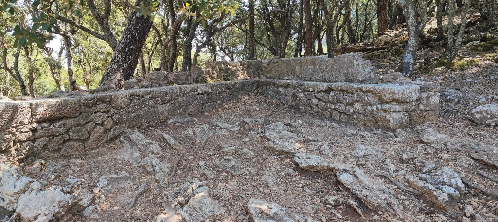 Los Cingles o riscos de Son Rullán finalizan en el bosque del Molí. Es un espeso bosque de encinas, donde el camino describe pequeñas y numerosas curvas y donde vemos los restos de la antigua actividad de los carboneros. En una curva cerrada que el camino hace hacia la derecha, sale un sendero, poco perceptible, que conduce a las ruinas de la Ermita de Sant Nofre y al Estret de Son Gallard, que obviamos. Seguimos la dirección que indica una estaca GR situada en la misma curva. Vamos descendiendo trazando varias lazadas hasta llegar a un cruce de caminos, justo donde se encuentra un horno de pan muy bien conservado.