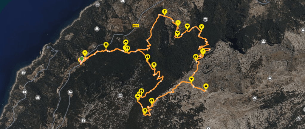 Aquí se hace imprescindible el uso del GPS, pues la abundante vegetación, la ausencia de camino y señales y un terreno de muchos bancales, puede hacer que no sigamos la dirección correcta. De vez en cuando se vislumbra un tenue sendero que rápidamente desaparece. Después de un tramo de continua lucha con las ramas alcanzamos el Barranc de Son Gallard. Cruzamos el barranc (torrentera) y alcanzamos una pista de tierra que tomamos por nuestra izquierda. Esta pista en subida nos deja en el Camí de la Muntanya, punto donde cerramos el círculo de esta ruta.