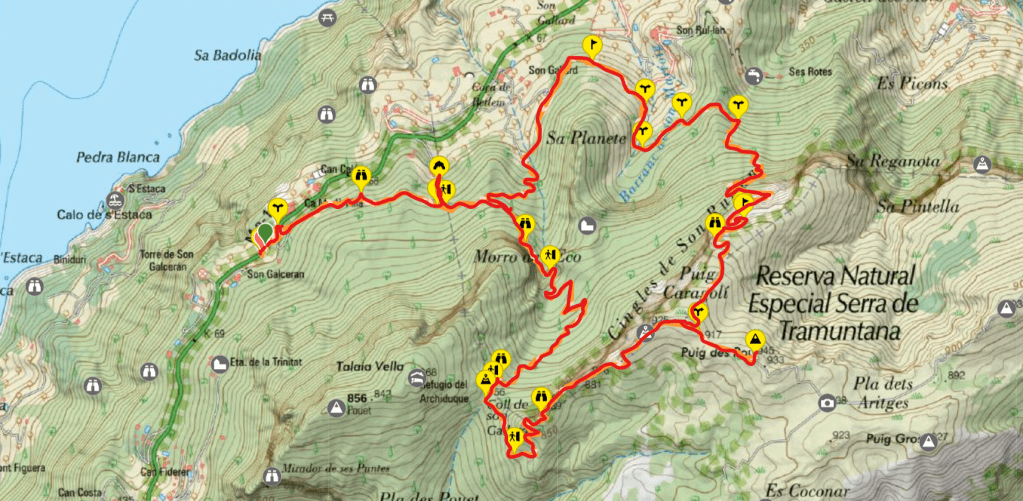 La ruta “Puig Caragolí desde Ca Mado” tiene como objetivo coronar la cima de esta montaña, situada a 944 m de altitud, en la zona noroeste de la Mola del Teix. Recorre el Camí de la Muntanya, el Camí de s’Arxiduc, el Camí dels Cingles de Son Rullán y Sa Planeta.