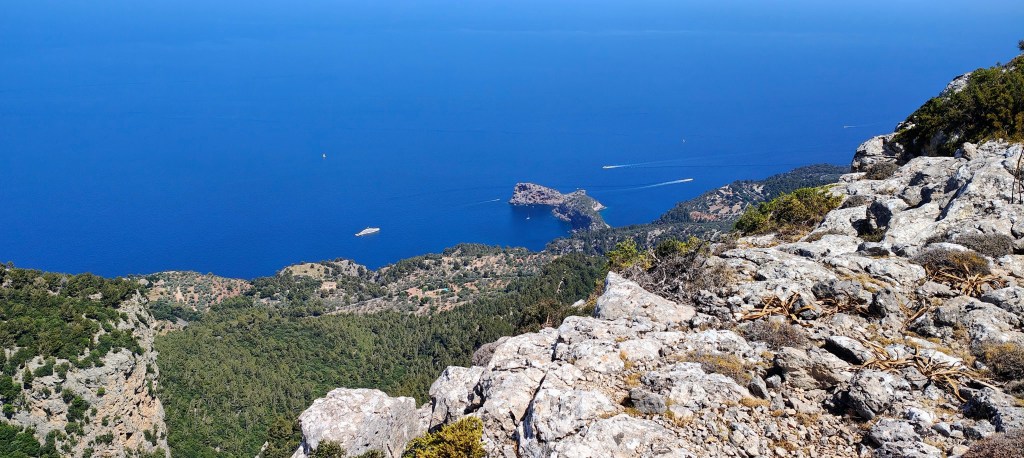 Avanzamos, ganando altura, por este precioso camino que empieza a ofrecernos unas vistas más amplias. Llegamos al filo de la cresta desde donde podemos ver la caseta- refugio del Archiduque en la cima de la Talaia Vella y también la Foradada, la Cala de Deià, Deià y el Puerto de Sóller. El bonito camino se acerca al borde de los acantilados por donde caminamos durante unos veinte minutos. No es recomendable pasear por aquí si se tiene vértigo. Desde aquí también podemos identificar nuestro objetivo: el Puig Caragolí.