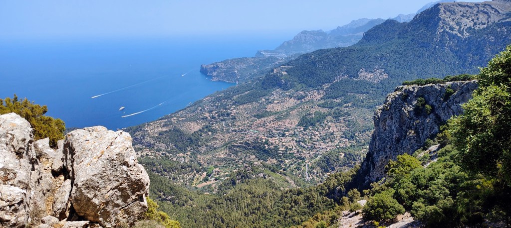 Poco después de dejar atrás los riscos vemos a nuestra izquierda los indicadores GR 221 que señalan el descenso hacia Deià por el Camí dels Cingles de Son Rullán. Continuamos un poco más por el Camí de l’Arxiduc hasta llegar al Puig Caragolí que vemos delante a tiro de piedra. Al llegar a su altura nos salimos momentáneamente de la ruta para acceder a su cima. Esta cima está situada a 944 m de altitud y ofrece unas vistas panorámicas extraordinarias. Podemos distinguir la Foradada, Cala de Deià, Deià, el Puerto de Sóller, el Moncaire, el Puig Major, Penyal de Migdia, El Massanella, el Puig de Sa Galera, el Puig des Vent, el Teix, etc.