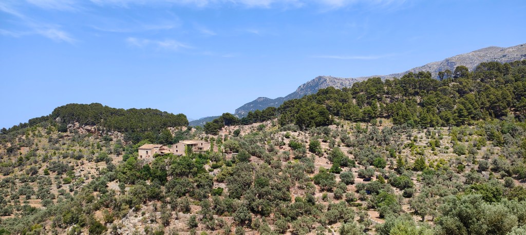 Después de disfrutar de estas vistas descendemos al Camí de s’Arxiduc y retrocedemos hasta los indicadores GR 221 que señalan la bajada hacia Deià. Al principio el camino, bien señalizado con postes GR, desciende por un roquedal. Luego vemos un indicador GR 221 y un letrero puesto por el Govern de Illes Balears que reza “Fi de finca pública”, se entiende que marca el límite de la finca pública de Son Moragues. A continuación llegamos a un pequeño grupo de encinas y a una especie de mirador natural, desde donde tenemos una buena imágen de la Foradada y las casas de Son Marroig.