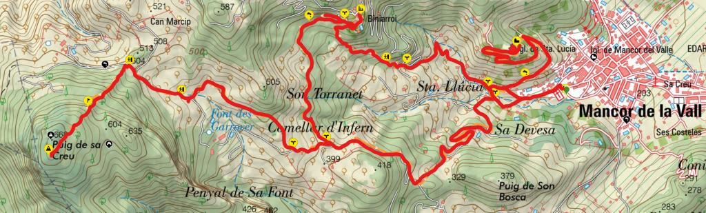 La ruta “Puig de Sa Creu desde Mancor de la Vall” tiene como objetivo coronar la cima de esta modesta montaña de tan sólo 664 m de altitud y visitar la aldea de Biniarroi y el Santuario de Santa Lucía, situados en el término municipal de Mancor de la Vall.