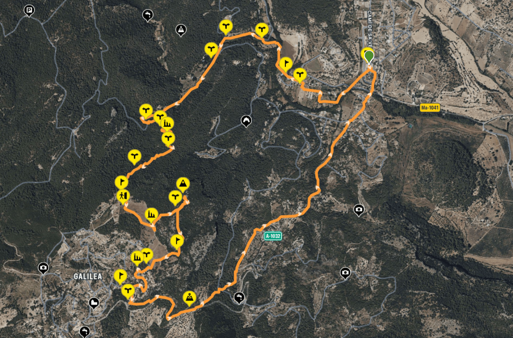 Continuamos descendiendo por esta calle hasta encontrarnos con el Camí de Can Pera. Este punto nos ofrece unas bonitas vistas de Galilea. Tomamos este camino asfaltado por nuestra izquierda y enseguida enlazamos con el Carrer dels Bous por el que seguimos hasta el final de la calle donde hay una casa con una pequeña torre. Aquí arranca el Camí de sa Cova des Bous, un bonito camino de tierra que desciende por una pendiente acusada hasta desembocar en la carretera Ma-1032 que une Galilea y Puigpunyent. Tomamos esta carretera por nuestra izquierda y poco después alcanzamos el Coll des Molí de Vent, situado a 386 m de altitud.