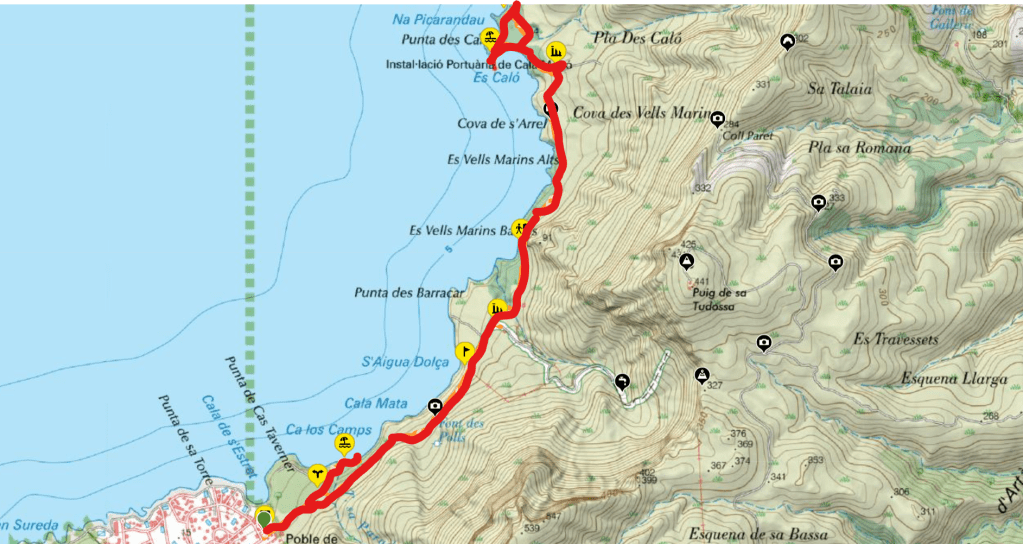 Seguimos la pista y entramos en el llamado Pla des Caló por un fresco pinar. El camino sigue paralelo a la línea litoral y en breve nos deja en Es Caló. Fue un antiguo puerto pesquero de reducidas dimensiones donde se instaló un pequeño dique o espigón, en el que probablemente amarraban sus barcas los pescadores de la zona, hoy se encuentra muy deteriorado por los embates de los temporales. Actualmente Es Caló es una cala con una playa de aguas limpias y cristalinas. Es un lugar muy tranquilo y silencioso, con unas vistas fantásticas, ideal para desconectar y disfrutar.