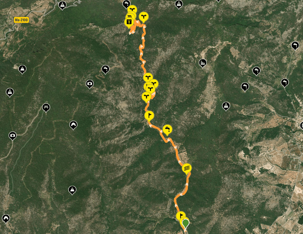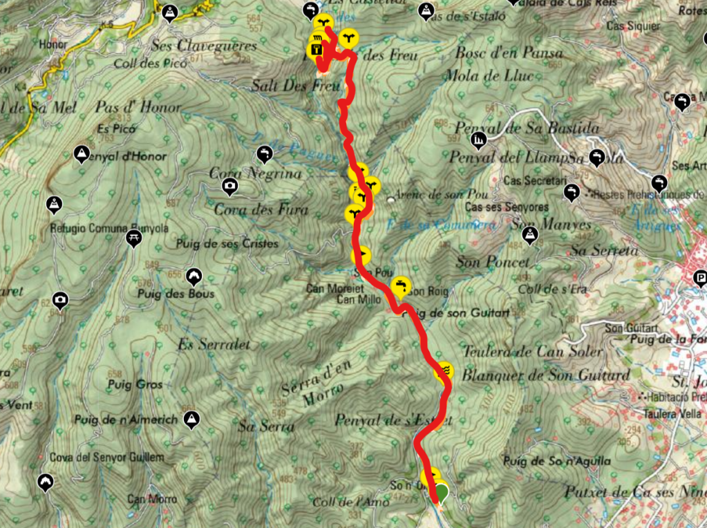 La ruta “El Salt des Freu desde Son Oliver” es, junto con la que se inicia en Orient, una de las rutas más habituales y valorada por los senderistas entre las distintas variantes que existen para ir a visitar este salto de agua. Este itinerario atraviesa el Valle de Coanegra, un paraje donde se mezclan caminos rurales, zonas de bosque y antiguas fincas como Son Oliver, Son Roig de Coanegra, Son Pou,etc. El objetivo principal de la ruta es llegar al Salt des Freu, una de las cascadas más singulares de la isla, donde el agua cae desde diversas alturas creando un entorno espectacular, especialmente si ha habido lluvias recientes. La belleza del salto se ve realzada por la vegetación y el musgo que rodea el torrente. El camino está bien definido y señalizado, con cierto desnivel en su tramo final.