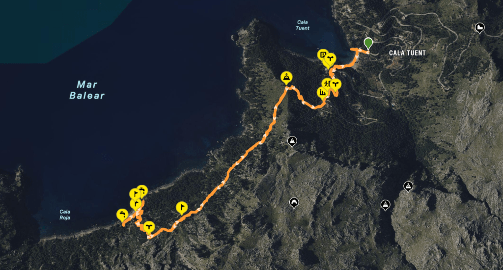 El punto de partida de este itinerario lo he situado en uno de los espacios reservados a aparcamiento que se encuentran en la carretera de Cala Tuent, justo antes de llegar a Es Moll de la Cala. Llegamos a este lugar por la carretera Ma-2141, conocida como la carretera de la Calobra. Un poco antes de llegar a las primeras casas, nos desviamos por la izquierda, por la carretera de Cala Tuent, hasta llegar al Coll de Sant Llorenç, situado a 217 m de altitud, donde se encuentra la Ermita homónima, del siglo XIII, y una amplia explanada.