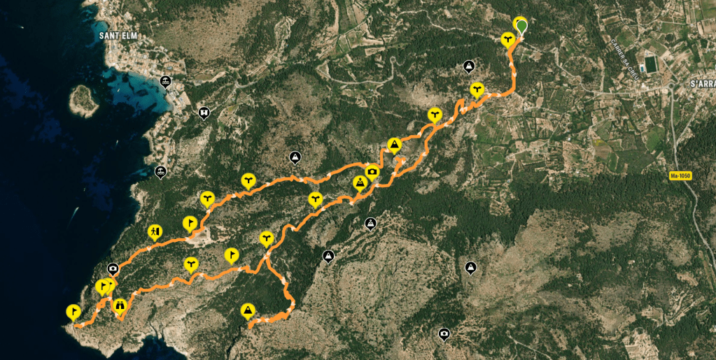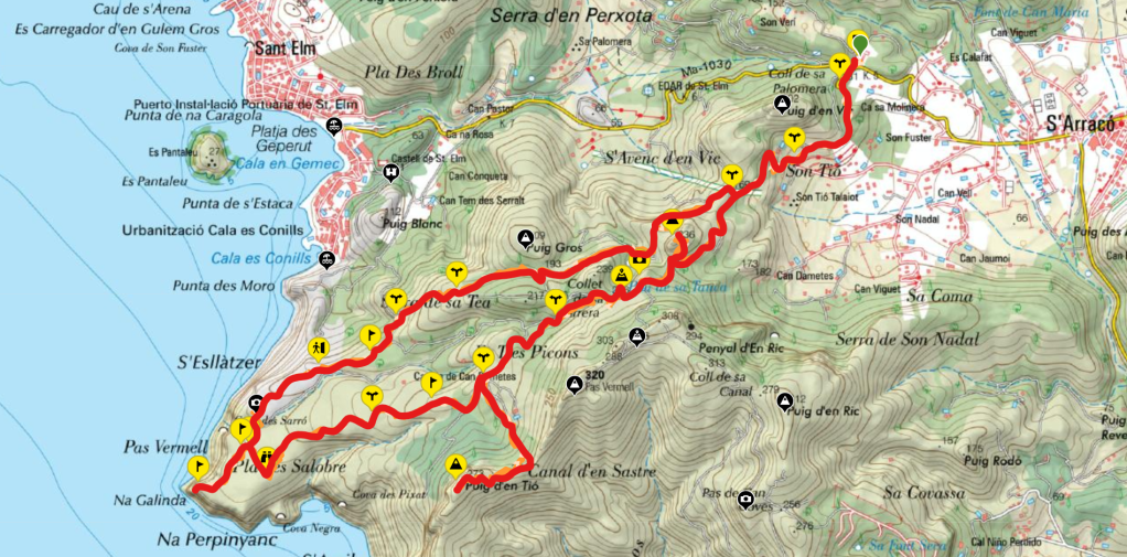 El punto de inicio de este itinerario lo he situado en el cementerio de s’Arracó, situado a las afueras de este pueblo, a la altura del kilómetro 5 de la carretera Ma-1030 que une esa localidad con Sant Elm. Dejamos aparcados nuestros coches en el parking de ese lugar y comenzamos a caminar por la carretera dirección Sant Elm. Unos cien metros más arriba, cuando la carretera traza una curva cerrada a la derecha, la abandonamos para tomar el camino que sale por nuestra izquierda. Un poste metálico de color verde indica “Barri Son Tió”.
