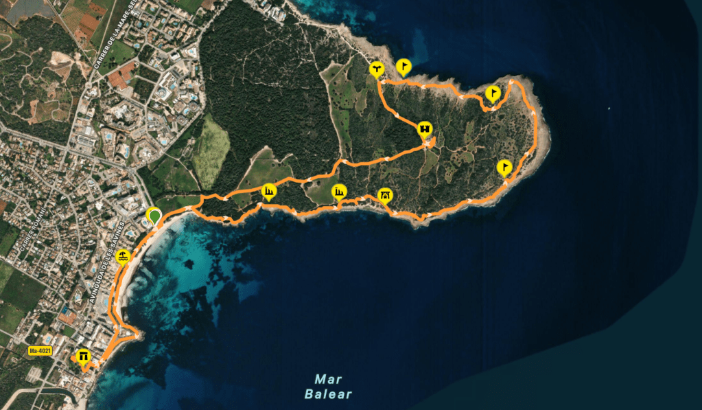 La ruta “Punta de n’Amer desde Sa Coma”, es una ruta corta, sencilla y accesible, ideal tanto para caminantes ocasionales como para familias. El itinerario parte desde la zona turística de Sa Coma y se adentra en el Área Natural de Punta de n’Amer, una península protegida caracterizada por caminos amplios, terreno llano y vegetación mediterránea típica. Durante el recorrido, el sendero discurre en su mayor parte por zonas abiertas con vistas al mar, también entre pinares y dunas, ofreciendo un entorno tranquilo y bien conservado. Uno de los principales atractivos es la llegada al Castell de la Punta de n’Amer, una pequeña fortificación del siglo XVII situada en el centro de la península, desde donde se pueden disfrutar vistas panorámicas espectaculares de la costa. La ruta finaliza con una visita al cercano Poblado Talayótico, uno de los yacimientos prehistóricos más interesantes y accesibles de Mallorca.