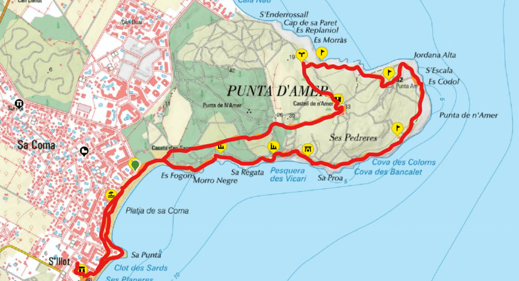 La ruta “Punta de n’Amer desde Sa Coma” tiene como objetivo recorrer viejos caminos y senderos del Área Natural de Sa Punta de n’Amer, situada entre las poblaciones de S’Illot y Cala Millor, en el término municipal de Sant Llorenç de Cardassar, así como visitar el Castell de Sa Punta de n’Amer y el Poblado Talayótico de S’Illot.