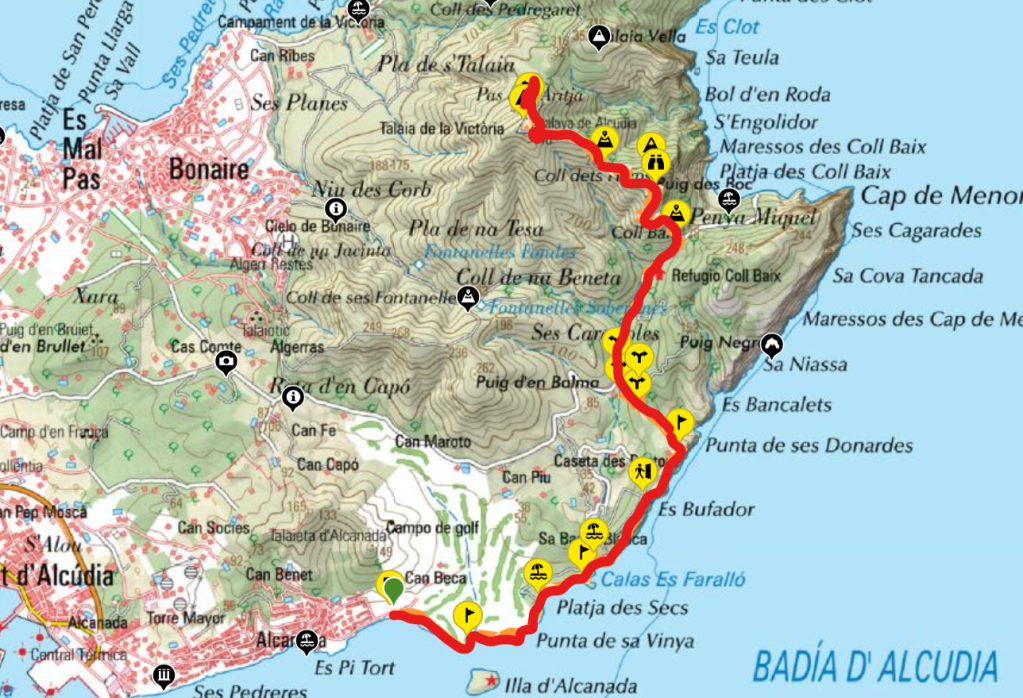 La ruta “Talaia d’Alcúdia desde Alcanada” tiene por objetivo subir a la cima de esta emblemática montaña de 446 m de altitud, la más alta de la península de La Victòria, situada entre las bahías de Alcudia y Pollença, partiendo desde la playa de Alcanada.