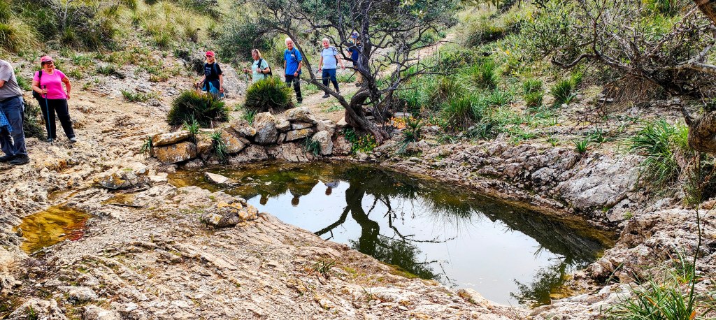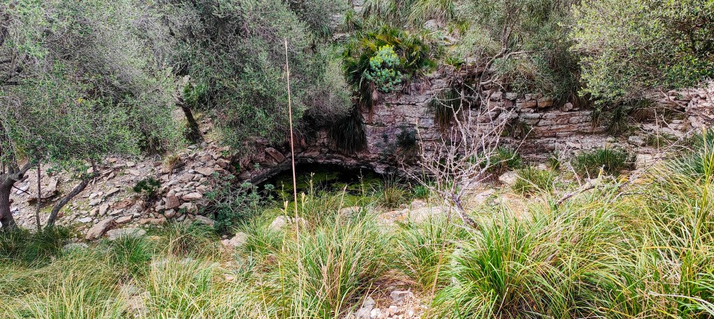 Seguimos por el camino de enfrente iniciando un largo descenso. Enseguida vemos a lo lejos la bahía de Pollença y la Península de Formentor y después llegamos a “Fontanelles Fondes”. Son otro conjunto de pequeñas surgencias de agua, pero en una zona más baja. Se parecen a las Sobiranes, pero con matices: más probabilidad de humedad constante o acumulación de agua (cuando la hay), pueden formar pequeñas charcas o zonas embarradas. Seguramente eran incluso más útiles que las Sobiranes por la mayor retención de agua y abrevadero más fiable.
