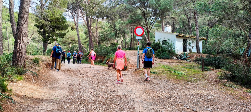 Comenzamos a caminar en dirección al Collet del Coll Baix, señalizado en un poste indicador de varias direcciones. Por el camino de la izquierda regresamos al final de la excursión. Proseguimos en muy suave descenso por nuestro camino, aún asfaltado, atravesando una zona de pinares continuos. Unos metros más adelante dejamos a nuestra derecha Can Fe y poco después una barrera tipo corredera por la que se accede por esta parte al extremo norte del Campo de Golf de Alcadena. Pasamos por una pequeña torrentera y luego por otra y en breve dejamos a nuestra derecha la casa de Ca na Piu detrás de un muro de piedra seca. Frente a la casa sale un camino cerrado con una cadena.