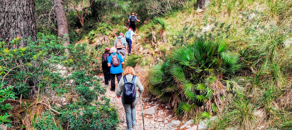 Hasta el cruce hemos recorrido un camino cómodo, progresivo y funcional, que puede resultar un poco largo y monótono. No es lo más espectacular de la ruta, pero es lo que hace posible toda la excursión. En el mencionado cruce tomamos el camino de la izquierda, donde el indicador señala la dirección del “Campamento de la Victoria» y de la “Ermita de la Victoria». Se trata del camino del Comellar de ses Fontanelles Sobiranes, denominado también en otros mapas como Coma de s’Egua. Es un bonito sendero de montaña que recorre todo el comellar. Sin duda es la parte más interesante de la excursión.