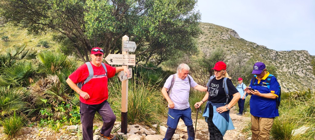 Escasos metros después nos encontramos con un cruce señalizado. De frente continua el Camí de la Muntanya hacia su destino el Collet del Coll Baix, donde hay un pequeño refugio y unas mesas con bancos de madera. Desde este collado salen dos senderos, el de la izquierda conduce en fuerte subida a la Talaia d’Alcúdia y el de enfrente es un sendero muy empinado y resbaladizo con tramos de piedra suelta que en descenso lleva hasta la Cala des Coll Baix. Ninguno es nuestro objetivo hoy ya que lo fueron de otras rutas.
