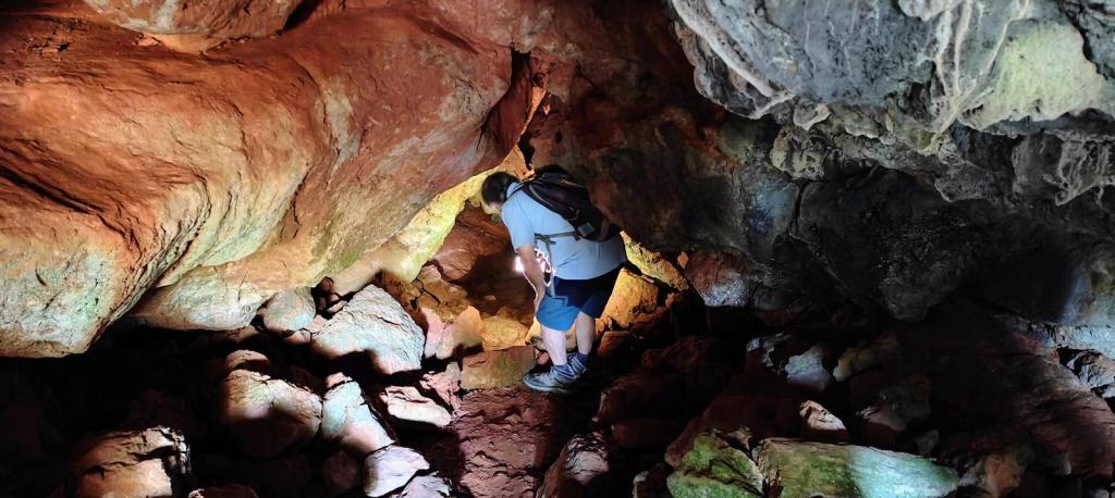 Avanzamos por este camino y un poco más adelante obviamos el ramal que sale por nuestra izquierda que conduce al Penyal Vermell. Nuestro camino va describiendo una amplia curva a la derecha y llegamos a un cruce de caminos. El de la izquierda lo tomamos luego, ahora seguimos por la derecha para dirigirnos en fuerte descenso a la Font de s’Almangra. A pocos metros del cruce se encuentra esta fuente, cuya ubicación, a 630 m de altitud, está señalizada con una pequeña flecha roja en la roca. La fuente nace en una cueva natural, llamada Cova de Son Ferrandell o Vermella. En el fondo de la cueva está la surgencia y el agua se acumula en unas balsas naturales.