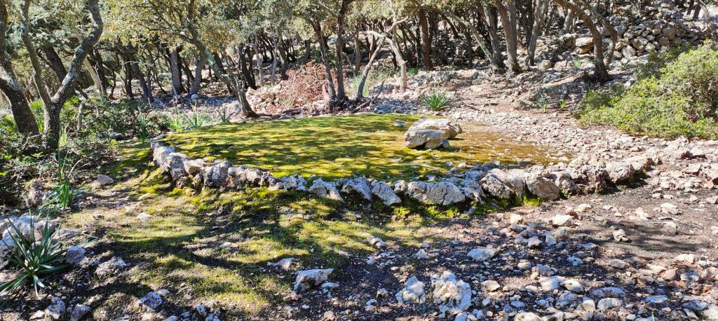Pasamos la línea divisoria de los términos municipales de Esporles y Valldemossa y entramos en este último término. Seguimos ascendiendo fijándonos en una hilera de hitos que nos van a acercar al llano de la Mola. Alcanzamos una zona alta de rocas más pequeñas que también nos ofrece magníficas vistas, destacando abajo y al fondo los campos de cultivo de Ses Planes de Canet. La subida ahora es más suave y en breve pasamos al lado de una Bassa, construida para almacenar el agua de lluvia mediante escorrentía, a través de rocas lisas que hay frente a su entrada.