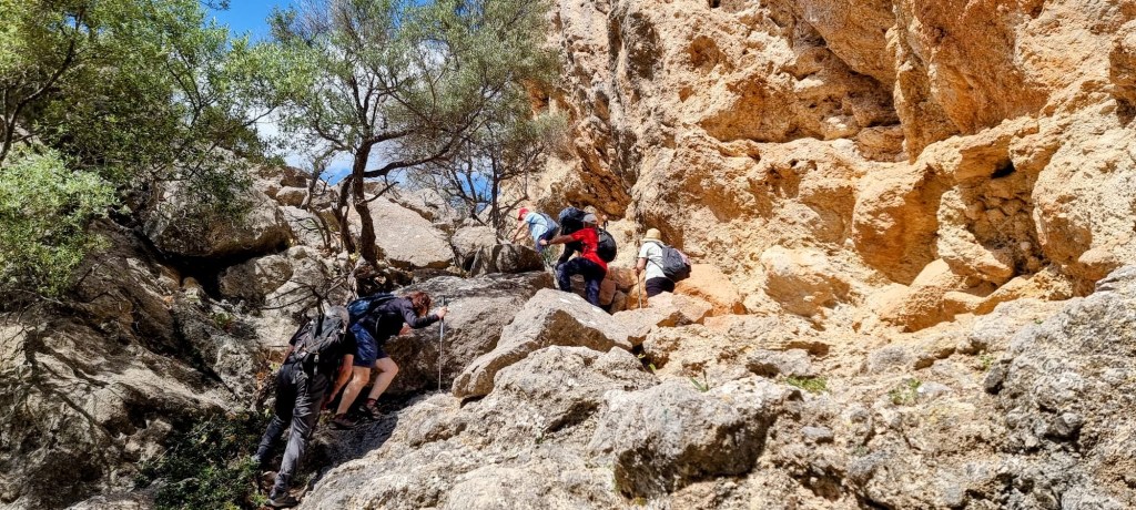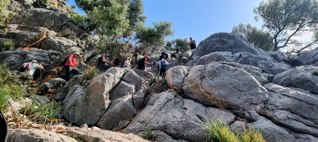 Es aquí donde se inicia el Paso. Comenzamos a subir sin dificultad por una ladera rocosa y escalonada, en dirección a un claro entre paredes rocosas que vemos a lo alto. El Pas de s’Ullastre, situado a 379 m de altitud, es un paso natural y escalonado junto a la pared de los peñascos de la Mola de Son Pacs, integrado en un entorno de encinar y bancales abandonados. Conecta la Coma d’en Llobera con Sa Mola. Es estrecho pero fácil de atravesar. No está equipado pero no presenta ninguna dificultad. Probablemente fue usado históricamente por pastores o carboneros.
