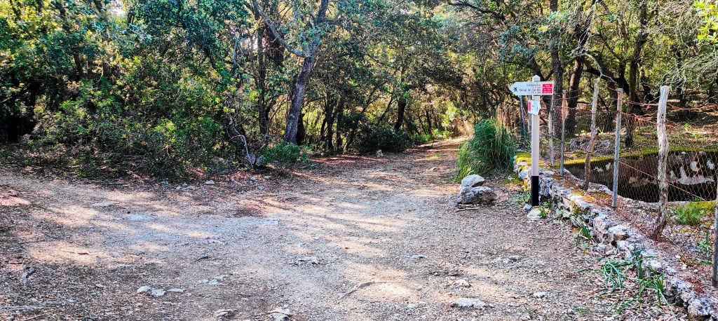Obviamos el camino de carro y seguimos de frente caminando ya por el Pla de Sa Mola. Unos trescientos metros más adelante desembocamos en otro camino más ancho, a la altura de un horno de cal con un árbol en su interior. Este camino, que ignoramos, viene desde las casas de Son Pacs, que se encuentran ya muy cerca de la carretera de Palma a Valldemossa, y pasa por un refugio de cazadores. Poco después dejamos a la derecha el camino que conduce al Pas Nou y a Son Brondo y enseguida alcanzamos un cruce señalizado.